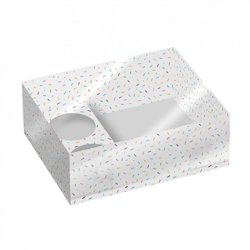 View full detailsFeatures a white box with multicoloured sprinkle pattern. Each box includes an insert for holding 2 cupcakes and a larger section (the hampe...