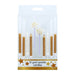 These elegant gold and white candles will make special occasion cakes shine brighter! The pack features a selection of tall, glitter, spiral and star shaped candles, each with food-safe pics for placing directly on top of a cake. They can be used to elevate a simple cake or compliment a more elaborate design. The different shapes and sizes of candles in the set are a quick and easy way to add interest and fun to the top of cakes.